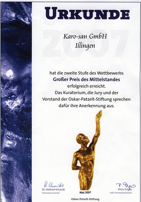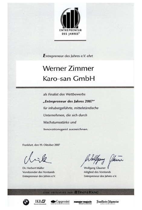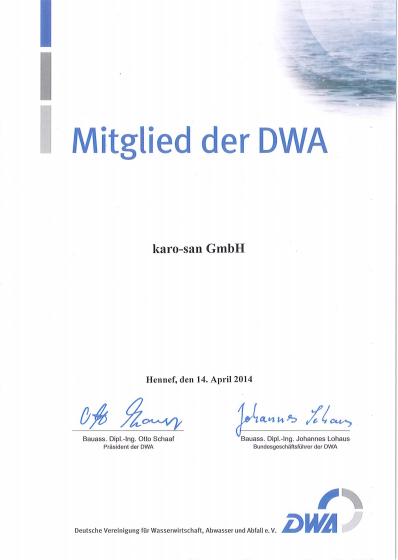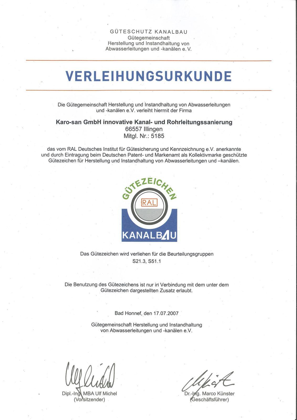 Die karo-san GmbH legt großen Wert auf Qualität und Innovation in der Kanal- und Rohrleitungssanierung. Dies spiegelt sich in zahlreichen Auszeichnungen und Zertifikaten wider, darunter das Gütezeichen, die europaweite Wortmarke "karo-san", die Mitgliedschaft in der Deutschen Vereinigung für Wasserwirtschaft, Abwasser und Abfall (DWA) sowie der Gewinn des "Großen Preises des Mittelstandes" und die Finalisierung zum "Entrepreneur des Jahres 2007".